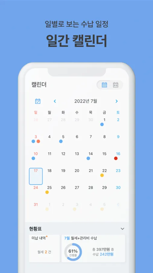 일별로 수납 일정/수납 상태를 보여주는 캘린더를 제공합니다. [일간 캘린더]