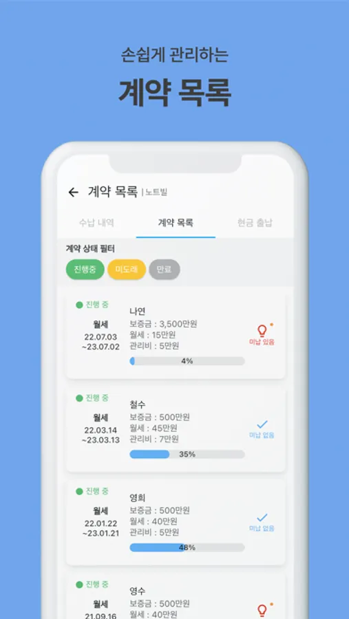 입력한 계약 정보를 토대로 빌딩 수첩이 자동 산출한 수납 내역을 토대로 간편하게 수납 관리를 할 수 있습니다.