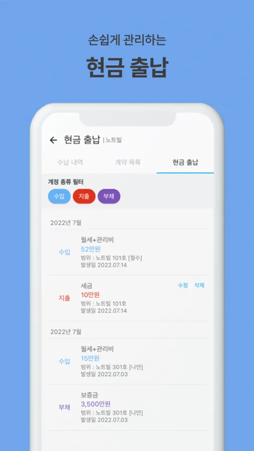 건물 레벨에서 [수납 내역], [계약 목록], [현금 출납] 정보를 조회하고 관리할 수 있습니다.