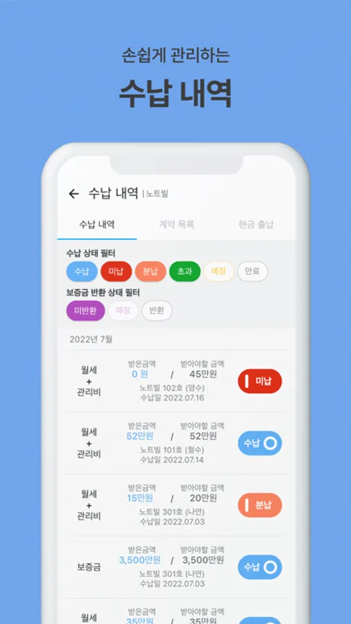 - 보증금, 월세, 관리비 상태 관리 (수납 / 미납 / 부분수납 / 초과수납 / 예정액과 다른 금액을 수납했지만 수납완료처리 등)