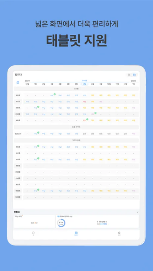방별로 월별 수납 상태를 일목 요연하게 보여주는 표를 제공합니다. [월간 캘린더]