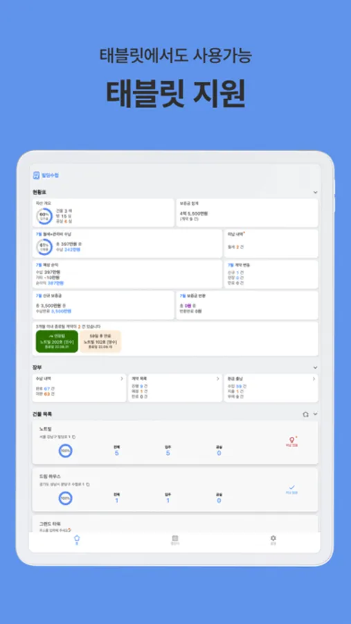 건물과 방, 계약을 등록하고 빌딩수첩이 제공하는 현황 정보들을 이용하여 간편한 월세 관리를 시작해보세요. 빌딩수첩은 앱 설치, 업데이트 과정에서 사용자에게 어떠한 비용을 청구하지 않습니다.