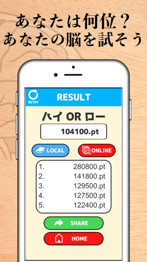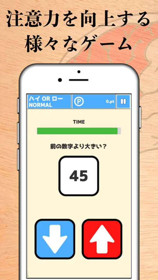 表示された数字がハイかローか矢印のボタンを押して答えましょう!