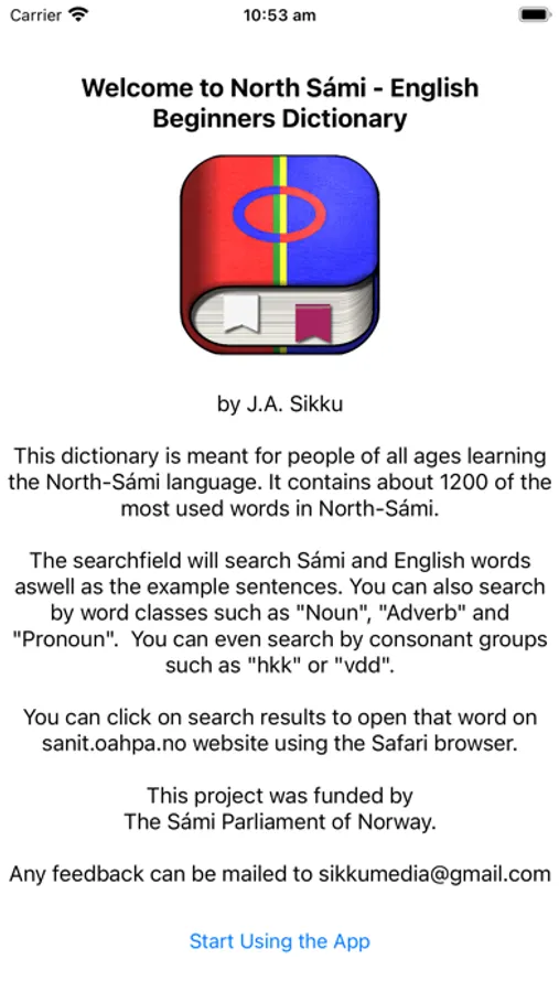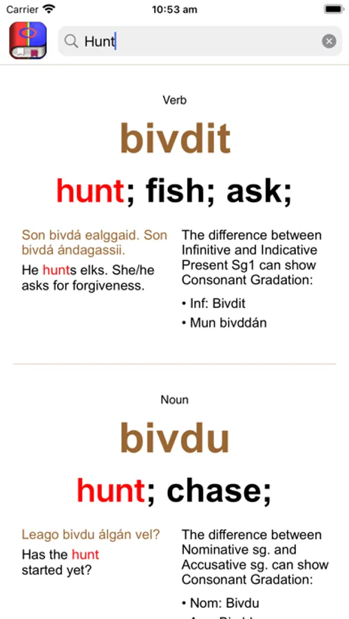 This dictionary app contains about 1300 of the most used North Sámi words translated to the English language. This app is meant for English speaking people who want to learn the North Sámi language or vice versa. The app contains a smart search function for easy lookups. The most used Verbs, Nouns, Adverbs, Adjectives, Conjunctions, Numerals and Pronouns are all included.
