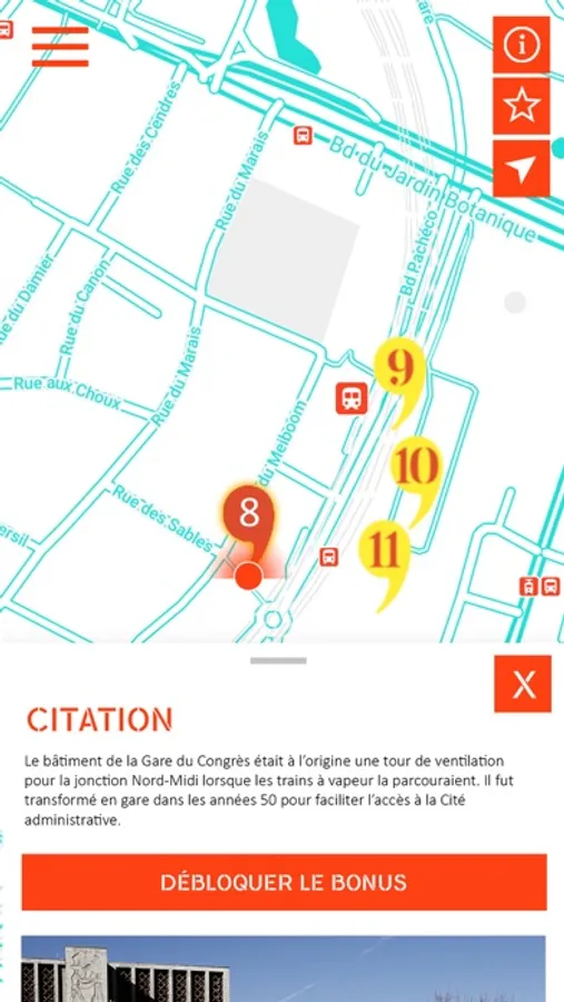 À chaque étape du parcours, une citation sur la danse apparaît sur votre smartphone, révélant une dimension poétique, politique ou sociale de cet art du mouvement. Jouez avec celle-ci en réalité augmentée et accédez au bonus lié : vidéos d’archives, invitations à danser, découverte de la ville et anecdotes historiques…