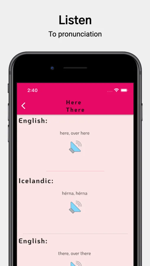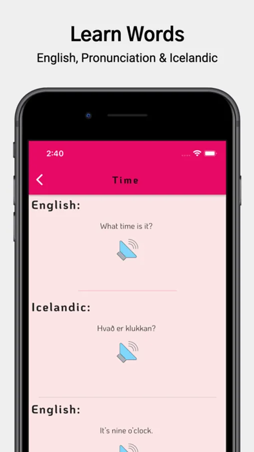 • In every lesson, you can listen to the Icelandic word pronunciation as well as see Icelandic word in english language.