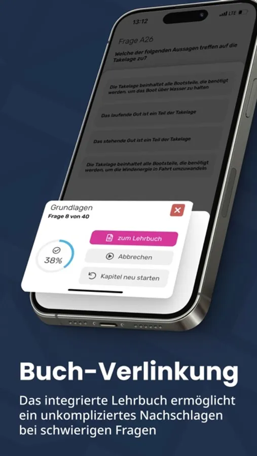 Diese App ist kostenlos installierbar und enthält optionale In-App-Käufe. Das digitale Lehrbuch, sowie die Funktionen Begriff-Suche und Buch-Verlinkung sind ausschließlich im kostenpflichtigen Modul BFA Binnen verfügbar. Zur Verwendung von Learnautik wird eine Internetverbindung benötigt. Es können Kosten für mobiles Internet anfallen. Die Prüfungsfragen sind ab einem Fortschritts-Level von 50% zugänglich. Beinhaltet möglicherweise Werbung.