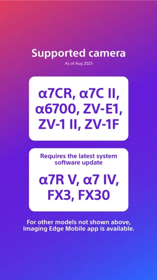 This application allows anytime, anywhere smartphone access to the Creators' Cloud, a platform that provides powerful support for creators from shooting to production with Sony's camera technology and cloud AI. By connecting this application to your camera, you can easily operate convenient functions such as photo and video transfer from your smartphone.