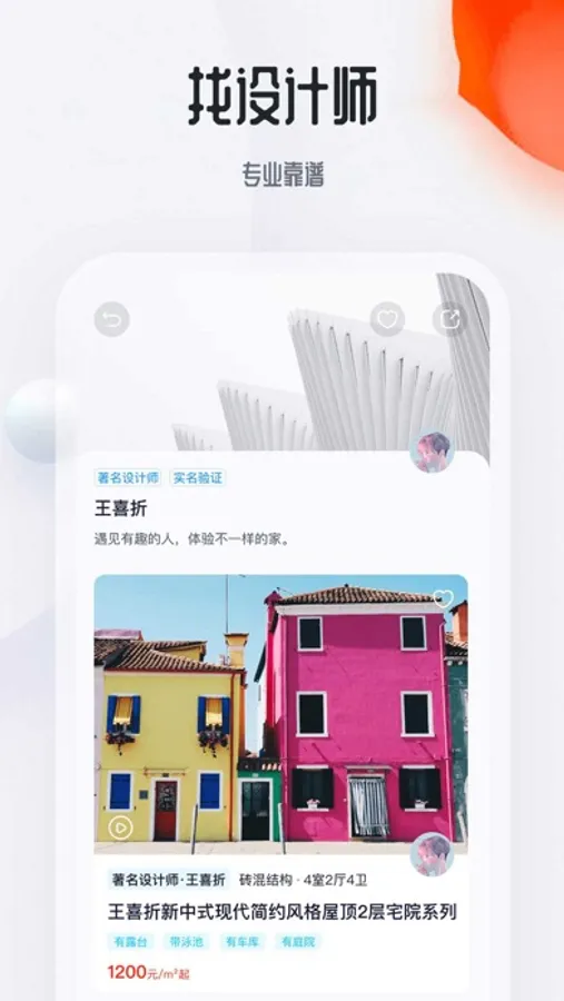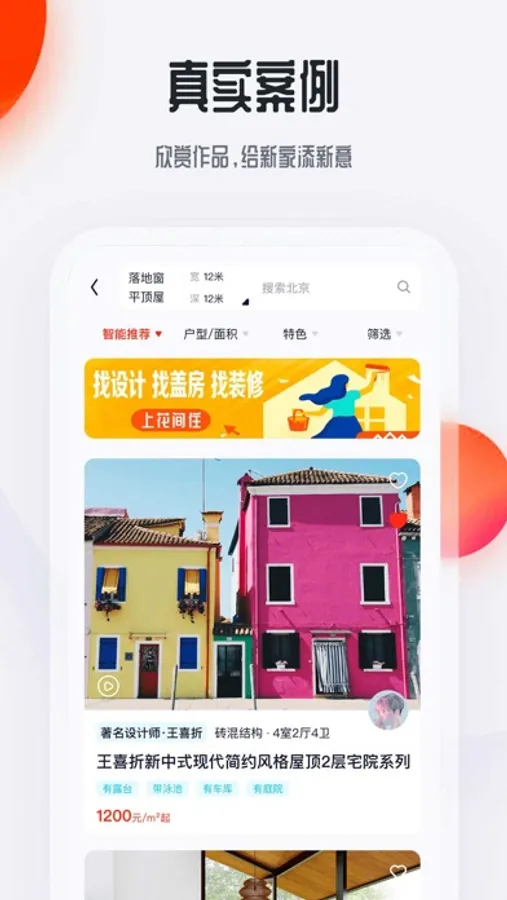 花间住是一个盖房家装综合服务平台,集图纸设计、建房施工、房屋装修、家居订购为一体;根据用户提交的房屋设计需求,与设计师确定最终设计方案及各专业施工图,平台提供工程建设服务;在施工的重要节点时,平台会派驻场建筑师去施工现场指导施工队。
