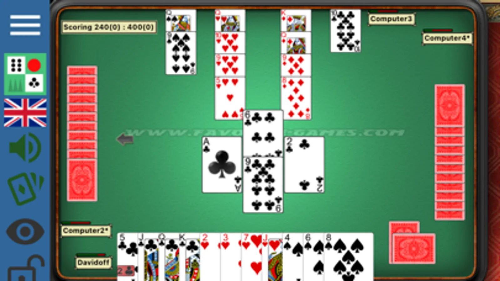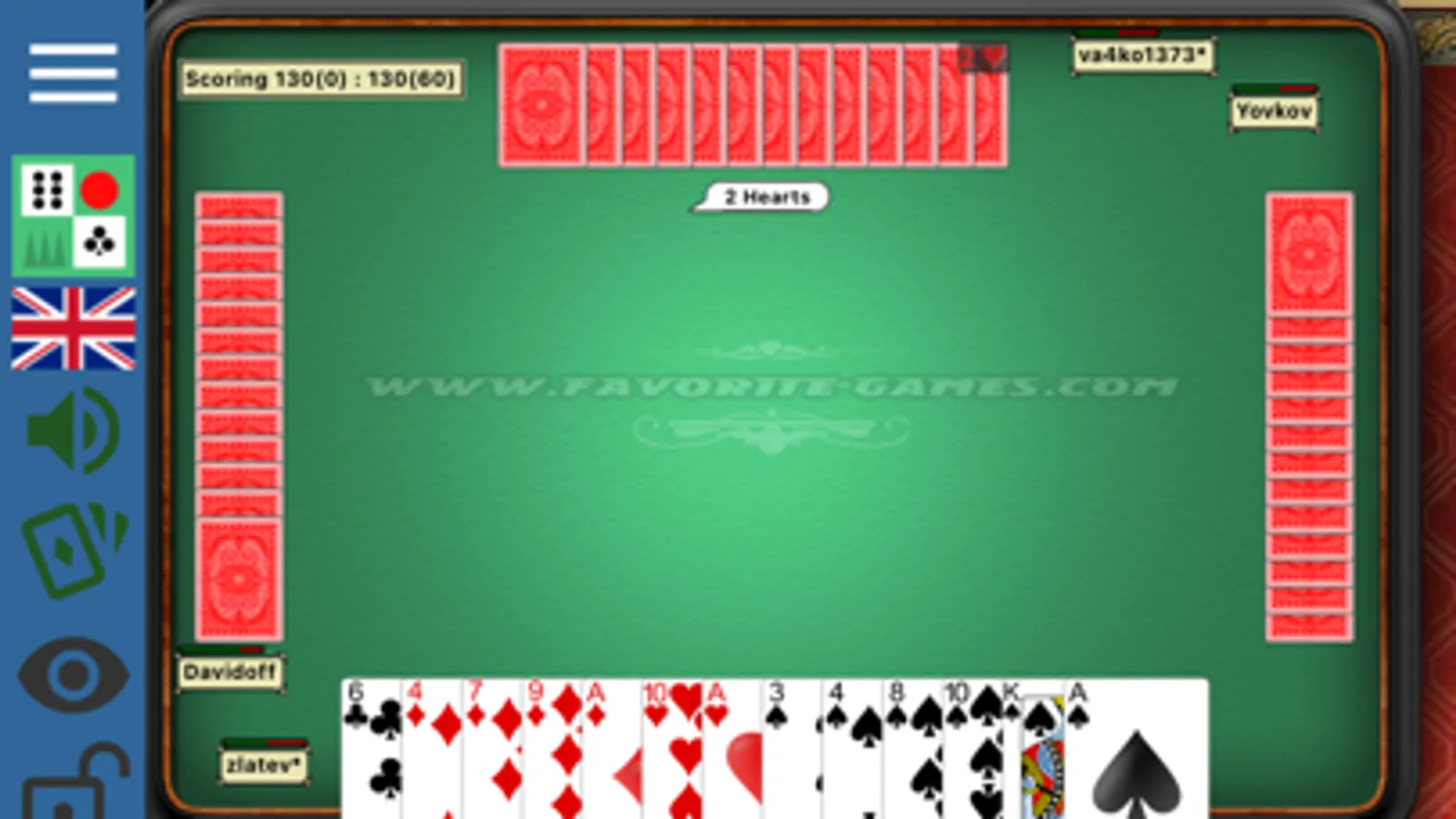 Rubber bridge is played with a standard deck of 52 cards. From high to low, the cards are ranked A, K, Q, J, 10, 9, 8, 7, 6, 5, 4, 3, and 2. Suits are ranked Spades , Hearts, Diamonds, Clubs. Four players play in two partnerships, with partners sitting opposite each other. Gameplay rotates clockwise around the table