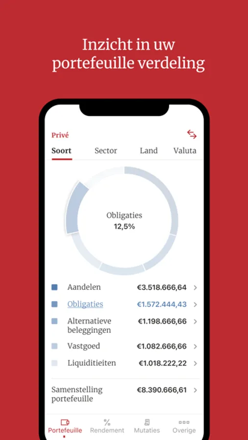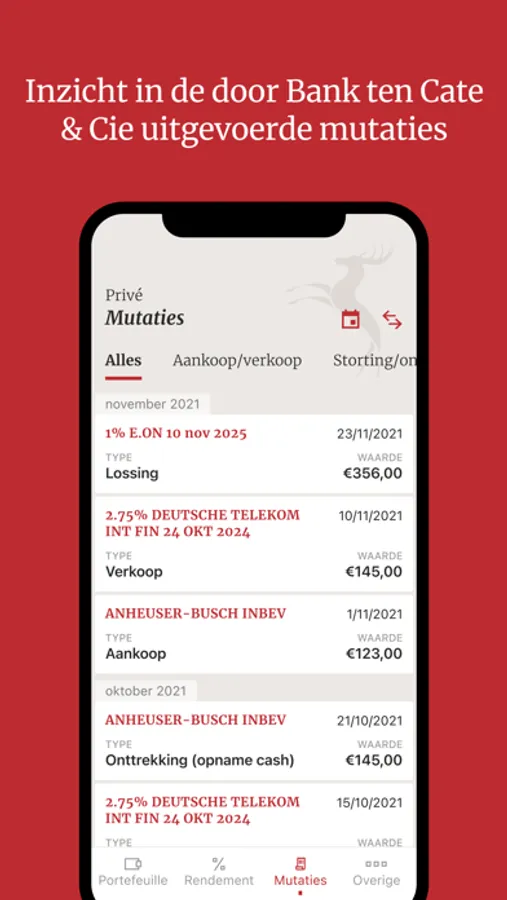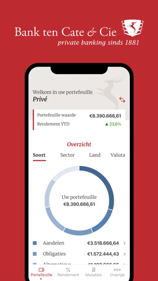 Als cliënt van Bank ten Cate & Cie heeft u actuele inzage in uw portefeuille(s). De app geeft u op iedere moment informatie over uw rendemententsontwikkelingen. Daarnaast kunt u zien waarin en waar ter wereld u in belegd. Naast bovenstaande functionaliteiten bevat de app een eenvoudig overzicht op gedane mutaties. De waarde van uw beleggingen wordt dagelijks aangepast op basis van de meest recente slotkoersen.
