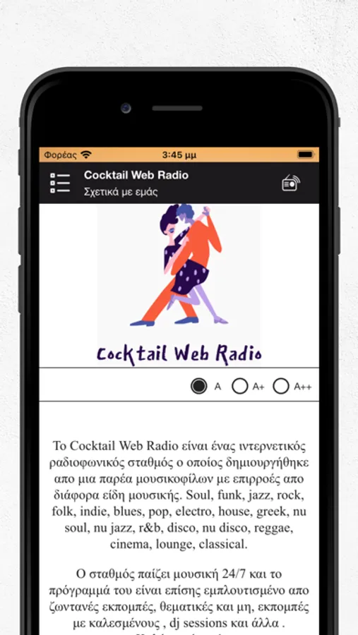 Το Cocktail Web Radio είναι ένας ιντερνετικός ραδιοφωνικός σταθμός ο οποίoς δημιουργήθηκε απο μια παρέα μουσικοφίλων με επιρροές απο διάφορα είδη μουσικής. Soul, funk, jazz, rock, folk, indie, blues, pop, electro, house, greek, nu soul, nu jazz, r&b, disco, nu disco, reggae, cinema, lounge, classical.