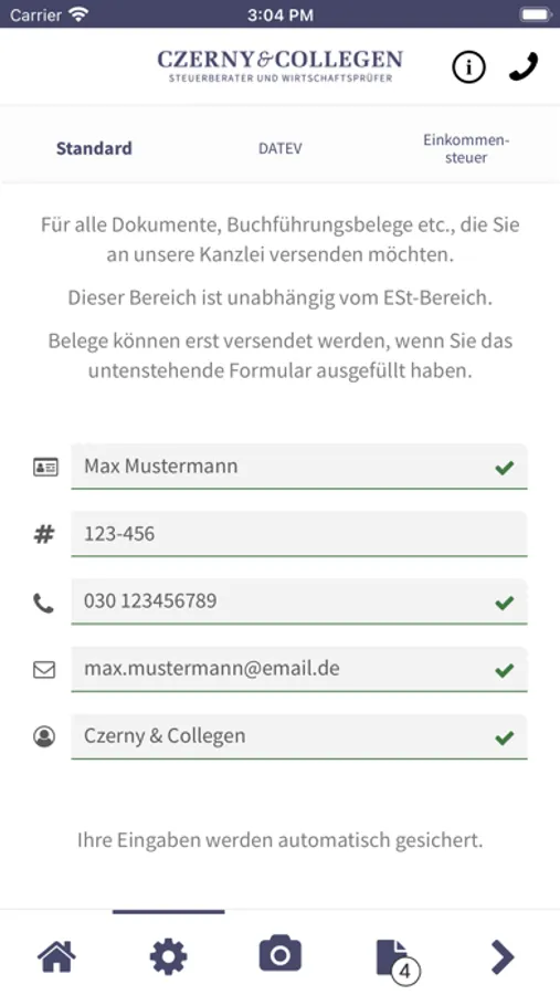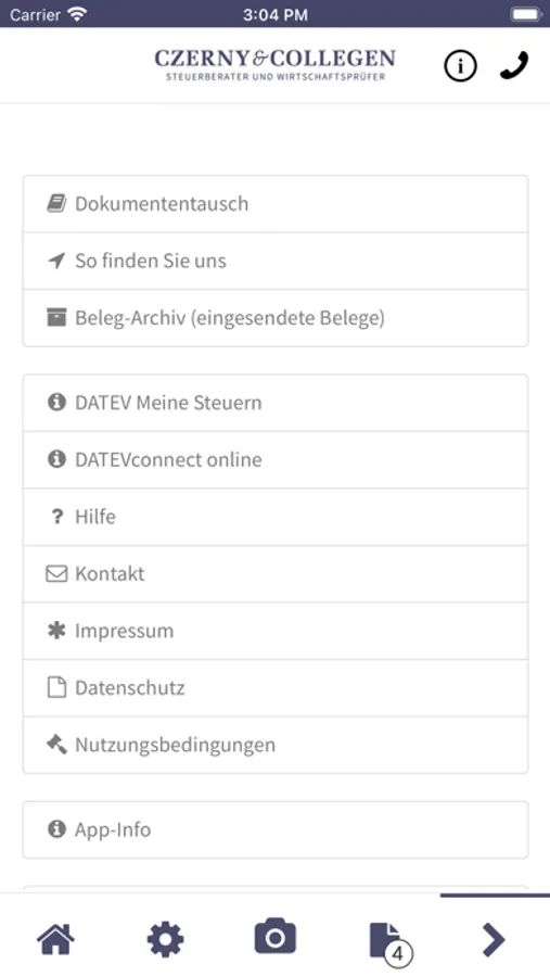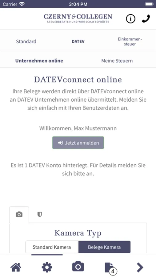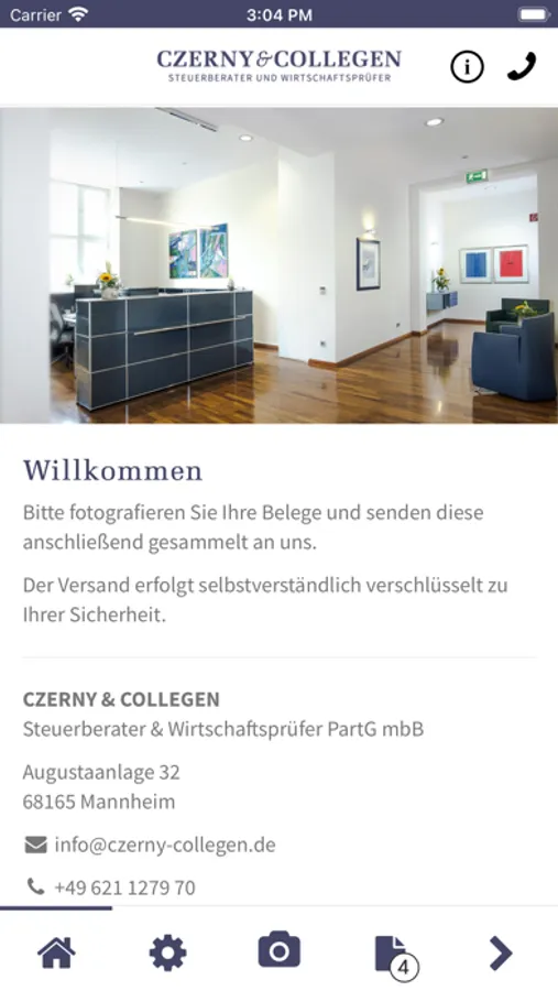 Mithilfe dieser App können Sie Belege, Dokumente und andere Schriftstücke schnell, sicher und komfortabel an Czerny & Collegen Steuerberater & Wirtschaftsprüfer PartG mbB gesendet werden.