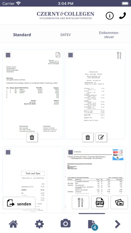 Machen Sie einfach ein oder mehrere Fotos von Ihren Belegen und versenden Sie diese mit einem Klick direkt aus der App heraus an Czerny & Collegen Steuerberater & Wirtschaftsprüfer PartG mbB