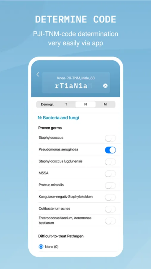 Using the PJI-TNM code, decisive criteria in periprosthetic joint infections can be considered and accurately classified in accordance with the oncological TNM classification. As a training tool, the app guides the user in a structured manner through the most important criteria, such as implant type and implant stability, biofilm maturity, pathogen characteristics, soft tissue conditions, comorbidities, and infection recurrence, thereby determining the correct PJI-TNM classification.