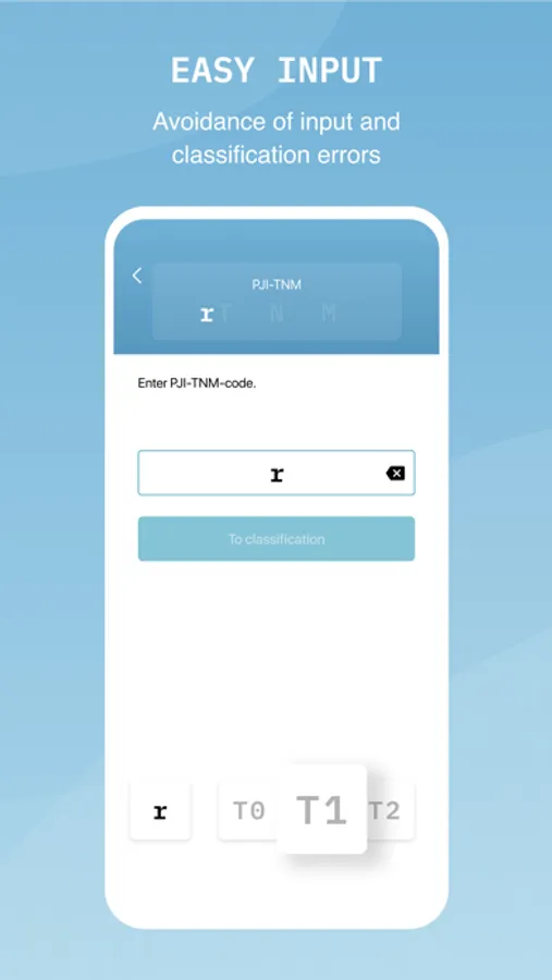 Clinical professionals complete a specially designed questionnaire to determine the PJI-TNM classification. After answering the questionnaire, the app provides the corresponding PJI-TNM code. Existing codes can be entered manually into the app to obtain all relevant information on existing periprosthetic joint infections.