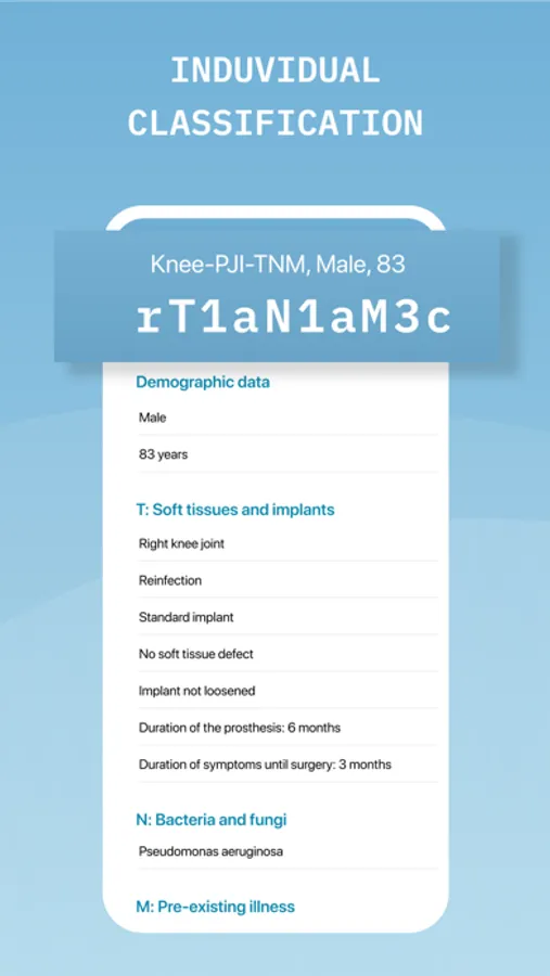 - Request all relevant information on an existing periprosthetic joint infection by entering the corresponding PJI-TNM code.