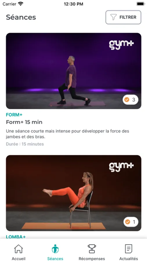 Conçue pour compléter votre pratique en club l’application gym+ vous permettra de suivre l’évolution de vos performances de façon ludique et d’évaluer votre niveau d’activité physique tout au long de l’année.