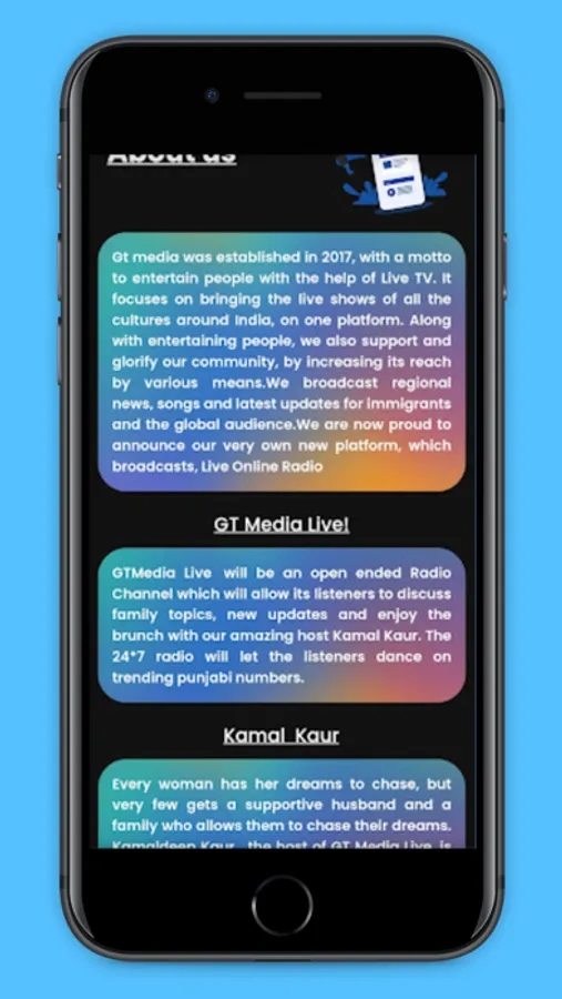 GT Media Live will be an open-ended Radio Channel that will allow its listeners to discuss family topics, and new updates and enjoy brunch with our amazing host Kamal Kaur. The 24*7 radio will let the listeners dance to trending Punjabi numbers.