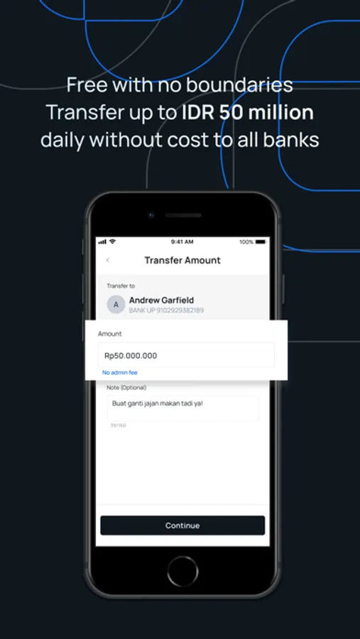 Tired of boundaries? Enjoy free transfers up to IDR 50 million daily without cost to all banks. Real-time, 24/7.