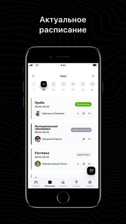 - Получать PUSH-уведомления о предстоящей тренировке за 3 часа;