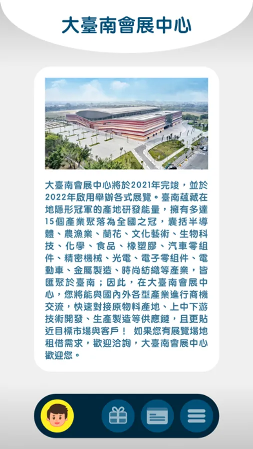 “ 大臺南會展元宇宙ICC Tainan Metaverse " 是 大臺南會展中心 ICC Tainan在經營5G會展場館,與舉辦各種會議或展覽活動的線上會展商務媒合App平台。提供給參展廠商與參觀者可以透過元宇宙的特性LBS( Location Basic Service) 即時定位的方式在線上找到彼此,也可以使用虛擬分身Avatar 在會展地圖上移動至每一個參展品牌攤位上,進行視訊對話邀請。無論是供應商或買家可以透過大臺南會展元宇宙App,遠端連線進入虛擬展會,除了搜尋參展的貿易相關資訊外,還能享有沈浸式體驗的會展元宇宙即時互動臨場感。
