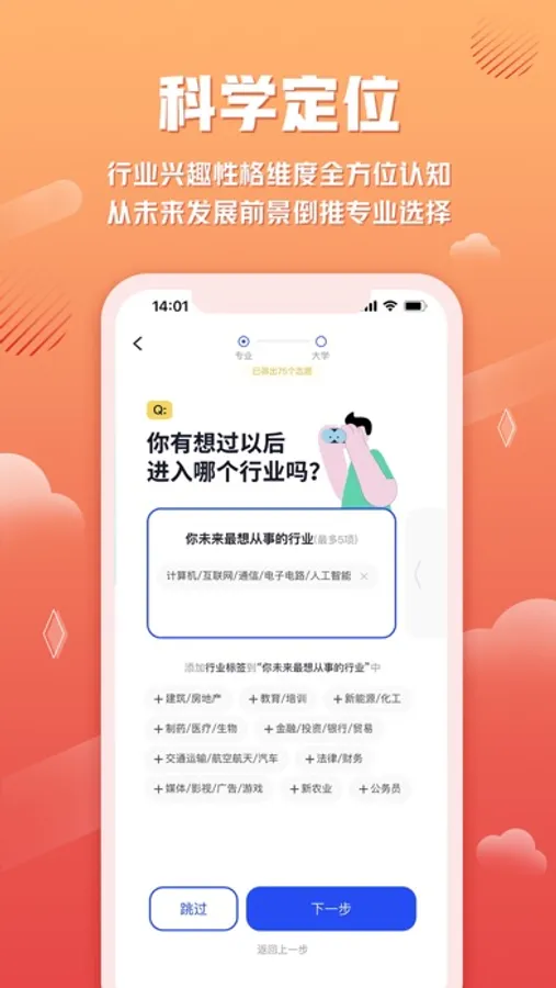 3、合理定位专业方向:行业意向、兴趣爱好两大维度助考生认知自我,依据选择结果推荐最适合专业