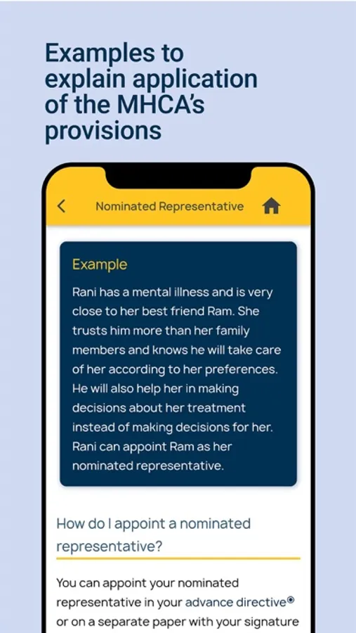 MHCA 2017 is an easy-read guide which explains the provisions of the Mental Healthcare Act, 2017 (MHCA) in a simple manner using examples and interactive features. You can access these features by choosing your user-type (person with mental illness/service user, caregiver, or mental health professional/service-provider) and the State you are residing in.