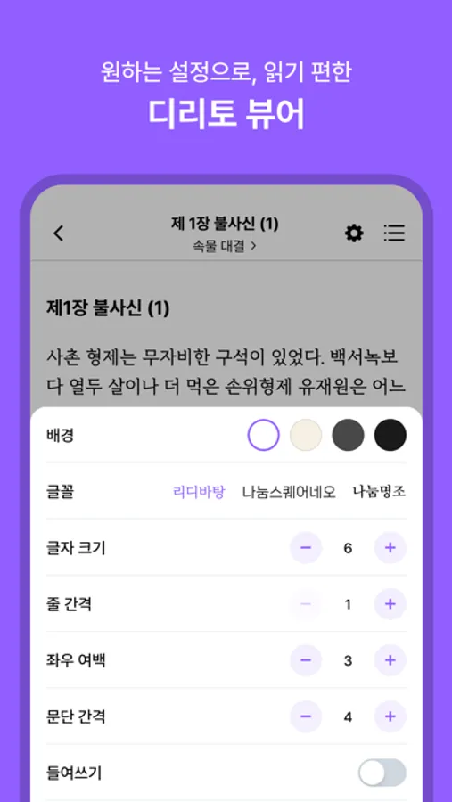 - 배경색, 글꼴, 글자 크기, 좌우 여백, 문단 간격, 들여쓰기로 원하는 뷰어로 설정해보세요.