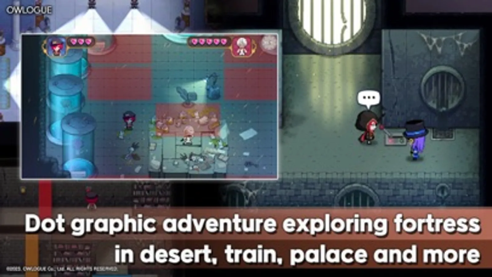 Dot graphic adventure exploring fortress in desert, train, palace and more