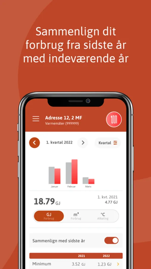 Med Fjernvarme Fyns app kan du se, hvor meget varme du har brugt i en selvvalgt periode. Du kan sammenligne perioden med tilsvarende periode sidste år. Og du kan sammenligne dit forbrug og se, om du bruger mere eller mindre end normalen for en sammenlignelig husstand.