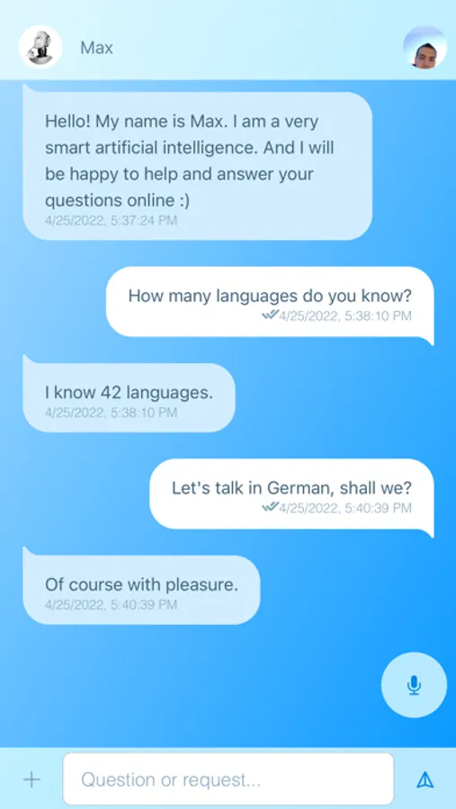 Max is a self-learning AI. It can search and analyze information in the Internet, handle reminders for important events, and communicate on any topic