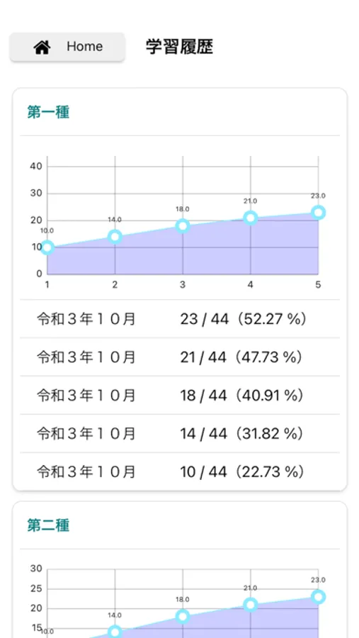 過去問から第一種/第二種の試験を学習することができます。学習実績をグラフで確認でき、学習成果を把握できます。