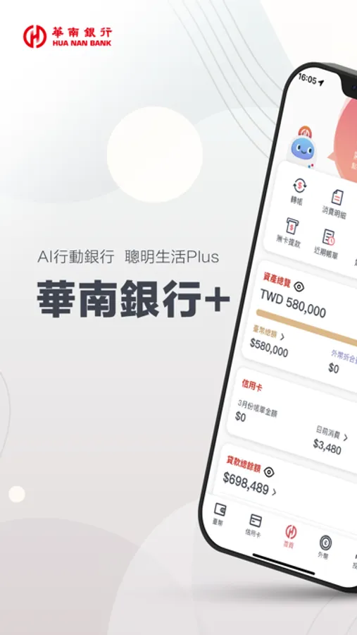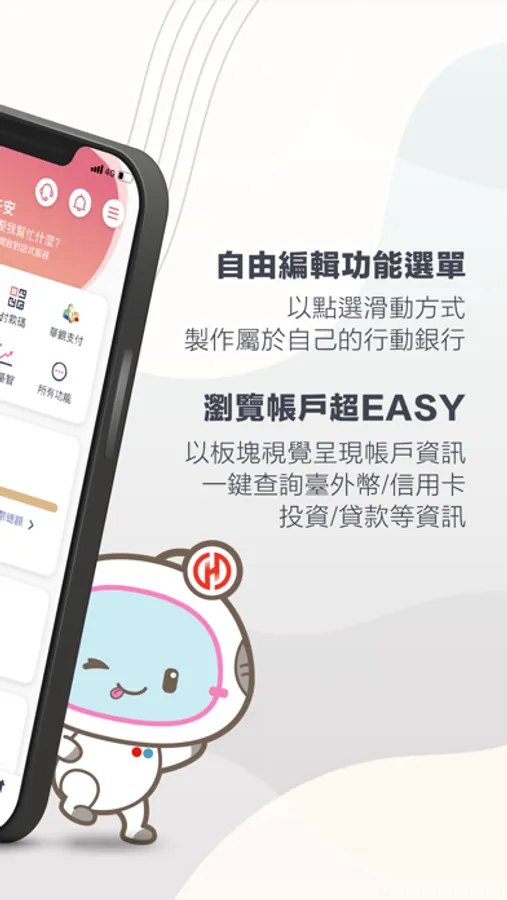 ※帳務查詢:臺幣/外幣存款餘額總覽、臺外幣活存明細查詢、交換票據扣帳失敗查詢、貸款餘額查詢、信用卡消費明細查詢等。