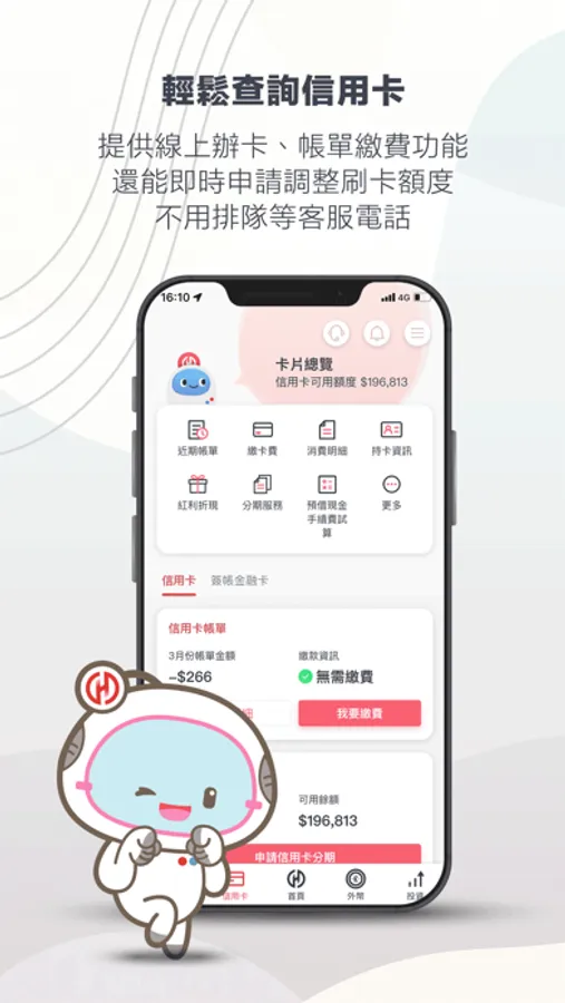 ※信用卡服務:信用卡/簽帳金融卡總覽、近3期信用卡/簽帳金融卡帳單查詢、線上繳付本行信用卡/簽帳金融卡費、信用卡紅利折現兌換/查詢等、線上申請信用卡、信用卡線上調額、信用卡分期服務。