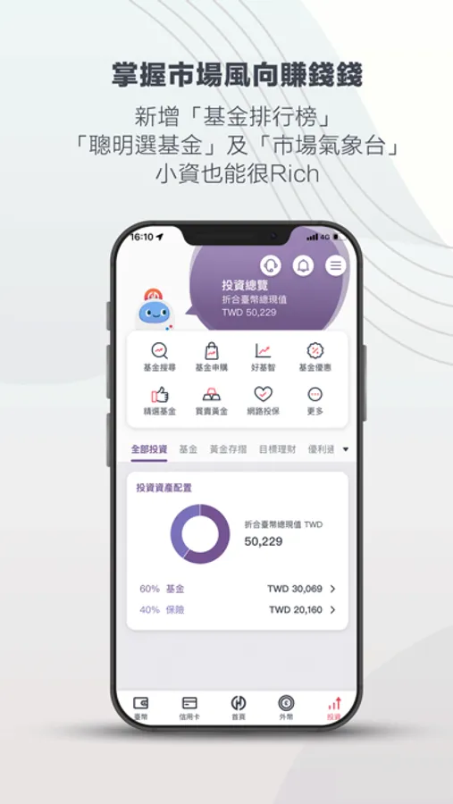※多元理財資訊:國際股匯市/台灣股市/各類基金資訊查詢、利率/匯率看板、黃金存摺牌告、貸款本息試算等,提供隨身理財資訊。