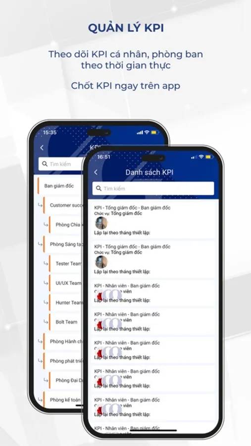 - Giám sát trực tiếp KPI của nhân sự, phòng ban cập nhật theo thời gian thực