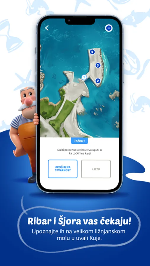 Simpatični likovi ribar Bepo i šjora Marija čekaju vas na točkama proširene stvarnosti na velikom ližnjanskom molu kraj obiteljske plaže Bura Bura (Salbunić) u uvali Kuje. Dođite ih upoznati!