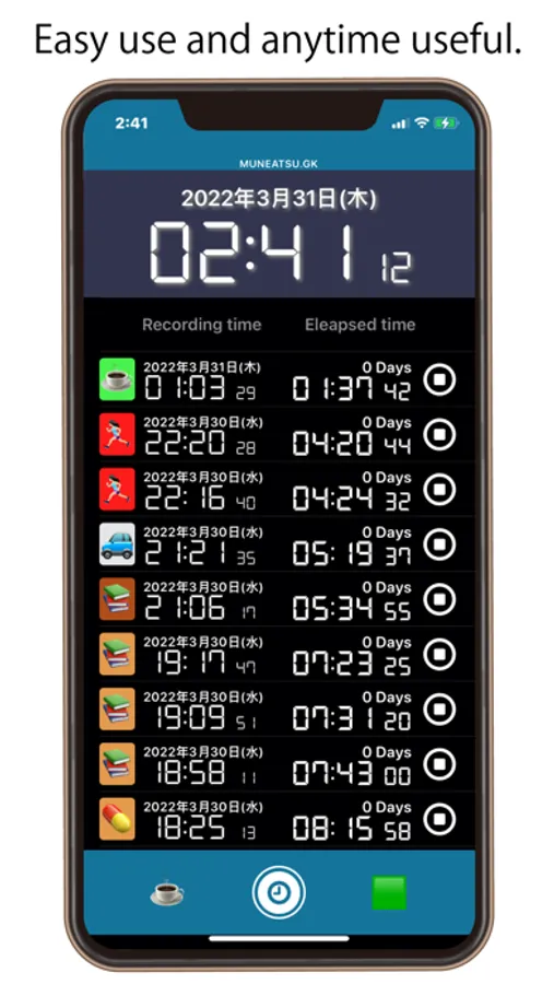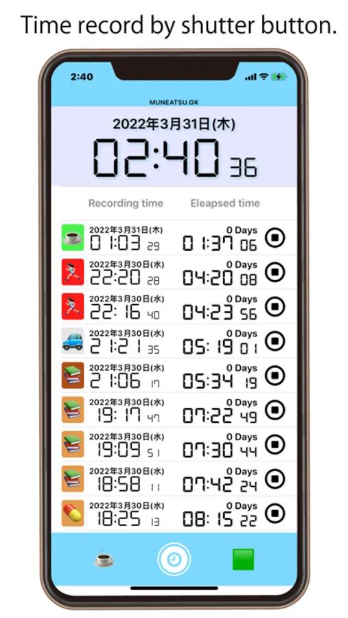 After launching the app, press the round shutter button at the bottom of the screen at the time you want to record, the time will be recorded and the elapsed time will be displayed.