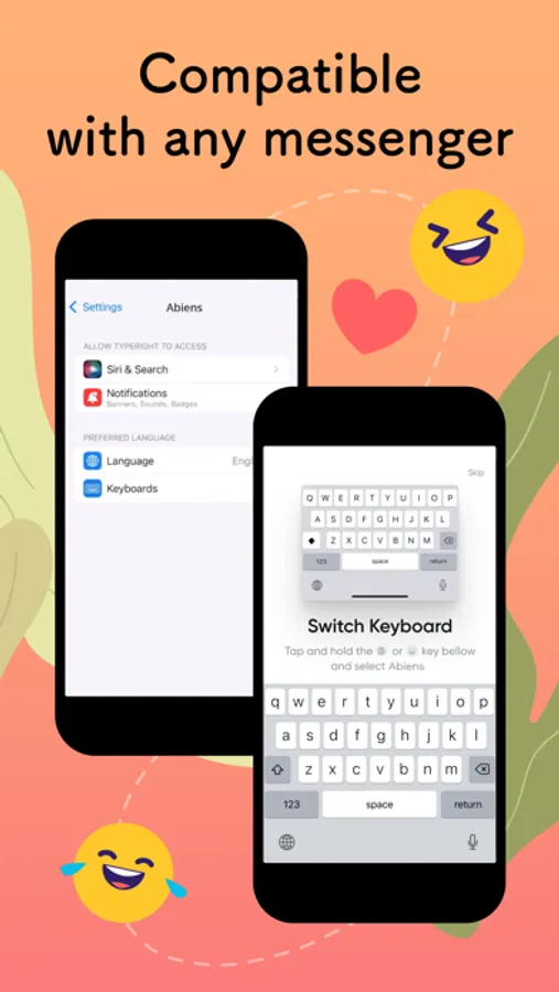 Abiens is a keyboard and your personal assistant for texting. You can find suitable phrases and answers for any occasion. If you want to make an impression on your match or find the perfect words to answer a friend's message, Abiens can help with that!