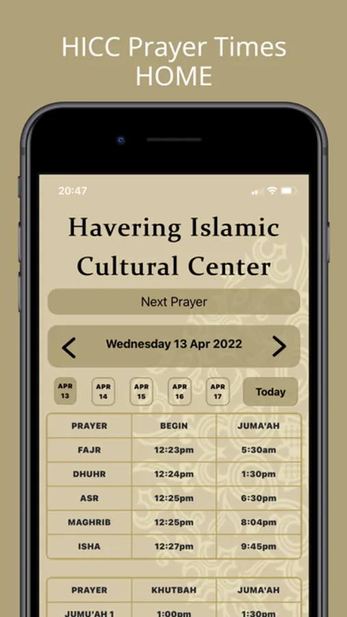 HICC Prayer times displays both begin time and Jama’ah times based on our location in Romford. The app is very simple to use, displaying the prayer time for today day on opening, and allows you to scroll through to check specific dates too.