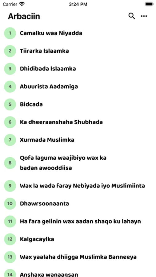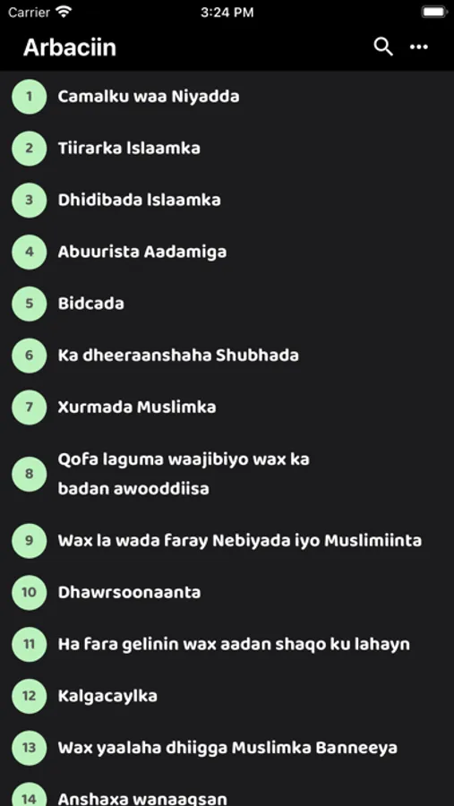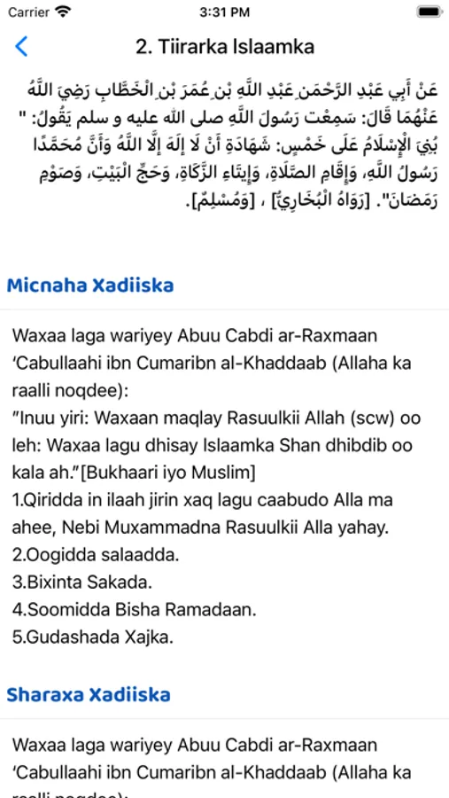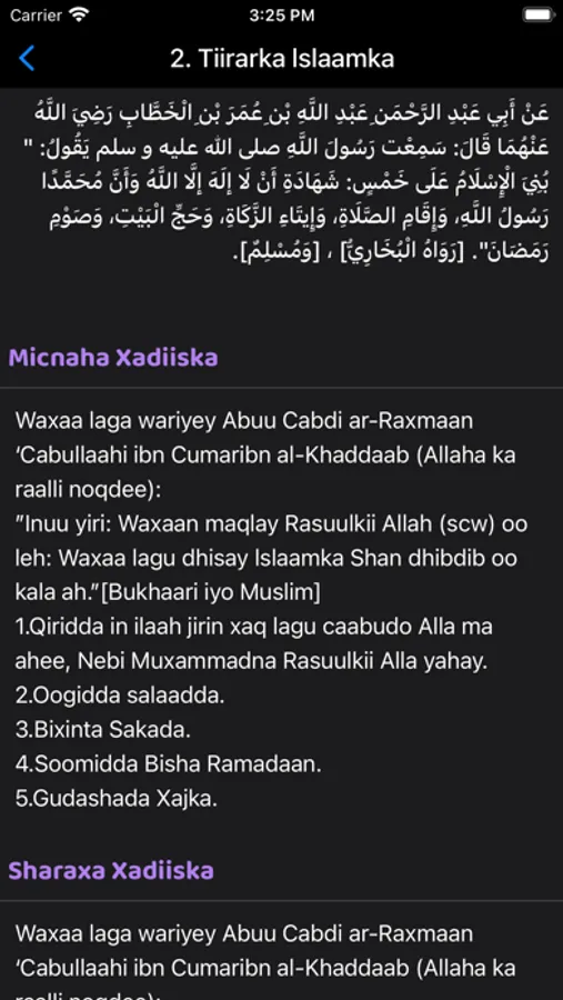 Xadiisyada appkan ku jira waxaanu ka soo xiganay kitaabka Arbaciin ka oo Afsomaali ku qoran oo uu turjumayTurjume: Cabdulcasiis Xasan Yacquub Qore: Sheekh Cabdul-Raxmaan Xuseen Samatar