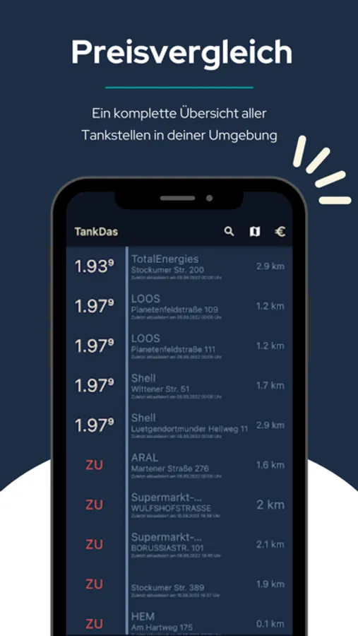 When the fuel prices drop, you can set a price alarm for the respective gas station. If the fuel prices fall, you will receive a notification.