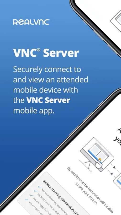 The RealVNC® Server mobile app from RealVNC® lets you securely share your mobile device’s screen with your IT technician or system administrator in just a few taps.