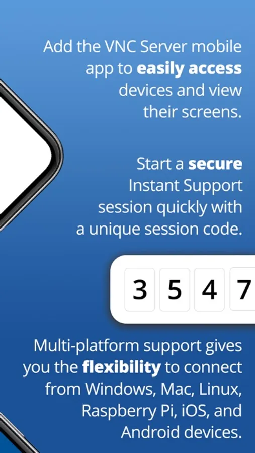 • ON-DEMAND ASSIST lets you set up a session in a flash using a secure one-time code that’s unique to your session. This option is available on RealVNC Connect Professional and Enterprise Instant Support plans.