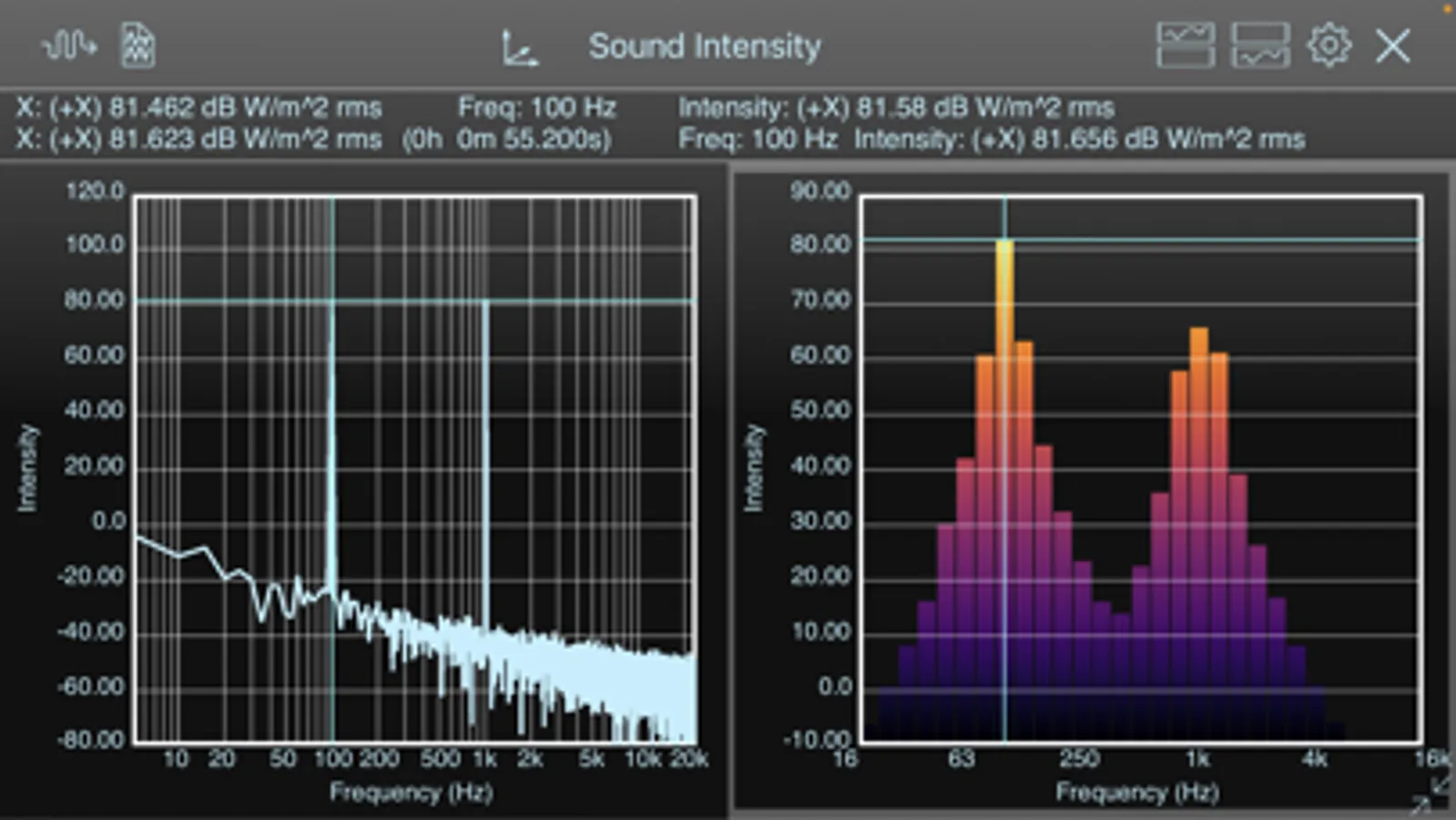 - Sound Intensity Analyzer - With a suitable p-p probe, measure sound intensity and acoustic particle velocity spectra (narrowband FFT and whole or 1/3-octave bands) and time waveforms.