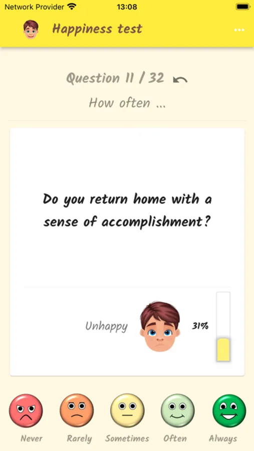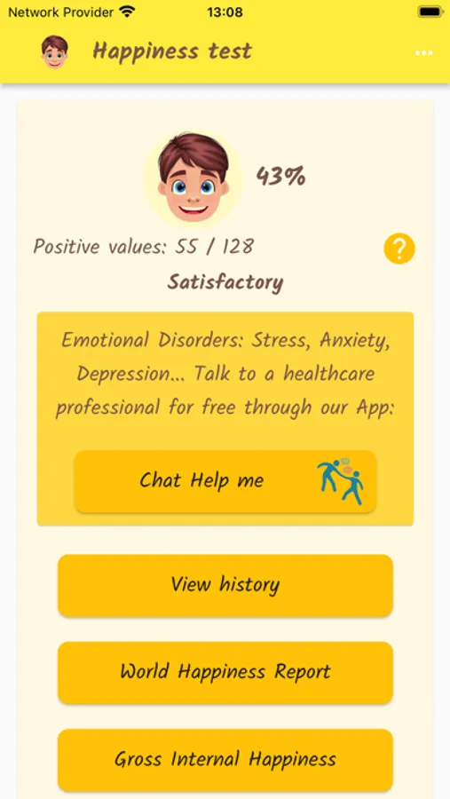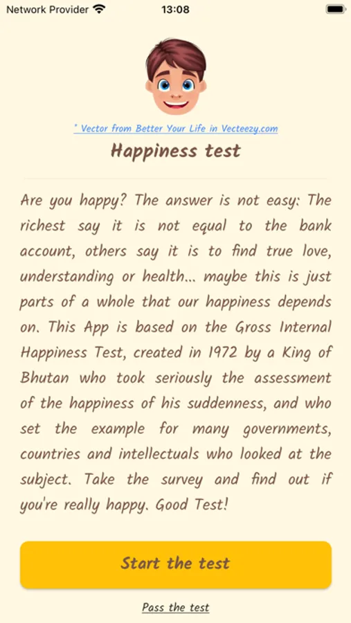This App is based on the Gross Internal Happiness Test, created in 1972 by a King of Bhutan, who took seriously the assessment of the happiness of his suddenness, and who set the example for many governments, countries and intellectuals who looked at the subject.