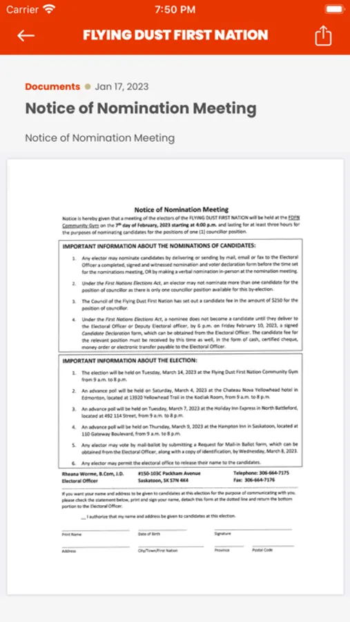 - Download, share, or print PDF or JPEG documents from the Band Office
