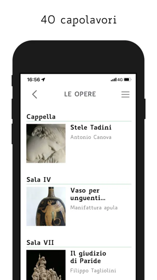 40 capolavori della Galleria dell'Accademia Tadini che potrai scoprire attraverso immagini, testi descrittivi e audioguide. Scannerizza i codici QR in prossimità delle opere, o naviga direttamente sull’app, per accedere ai contenuti multimediali, mettiti le cuffie o avvicina il telefono all’orecchio, scopri tutti i dettagli e lasciati guidare dalle narrazioni.