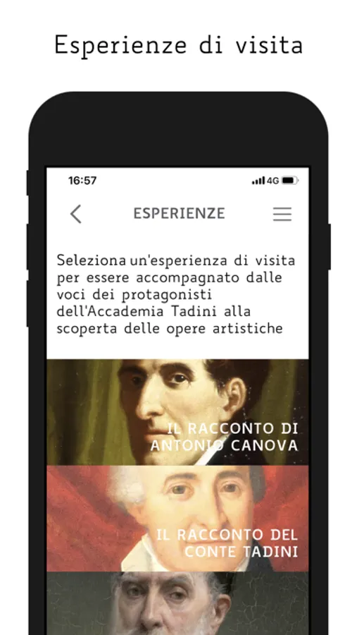 Accessibile a tutti e semplice da usare, la nostra applicazione ti permetterà di scoprire l’Accademia Tadini attraverso un'esperienza di visita innovativa e coinvolgente.